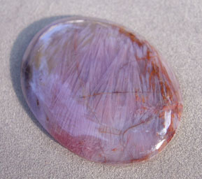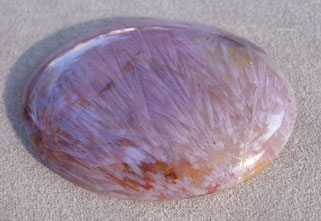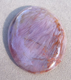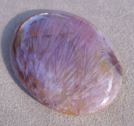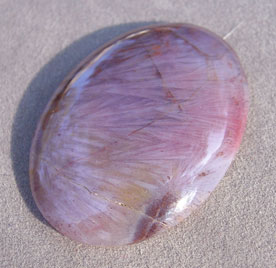 | Mexican lavender sagenite agate. You can see where this cabochon has been repaired in the lower third photo. It can still be used beautifully in the right jewelry application or simply as a stand alone addition to your collection or pocket stone. Because of the flaw we have a very low price on this gemstone. | |