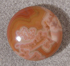 | Fine lacey banding and lighter color sets this small round Lake Superior agate cab off from the others. This cabochon is button shaped and has lower sides than the single striped cab in the next picture. | |