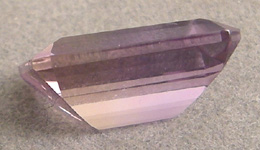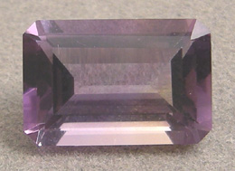 Emerald cut ametrine with mostly purple color and a little gold tint.