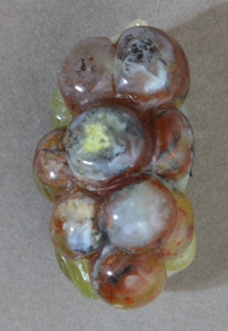 Squirrel carved from green opal with base from multicolored agate. Hole for stringing is in white opal above squirrel's head. |