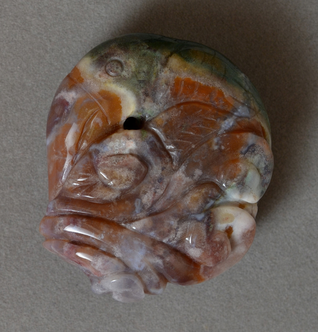 | Stylized bird carving from red and green Indian moss agate. Can be strung as a large pendant through hole under bird's chin area. | |