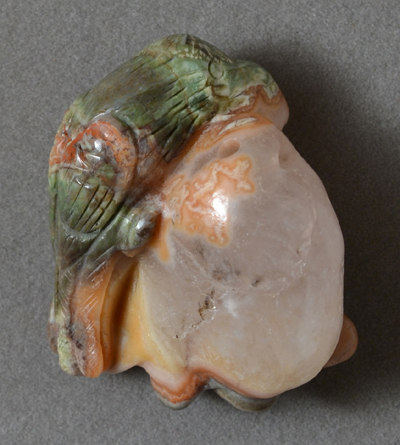 | Multi color agate from Idaho is used in this carving of a single bird on stylized flora. Drill hole for use as a pendant is through the top of the white and clear mass under the bird's beak in the second photo. | |