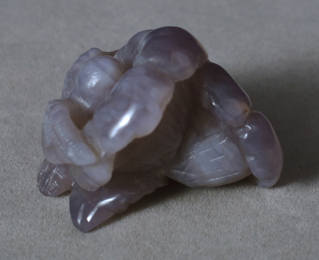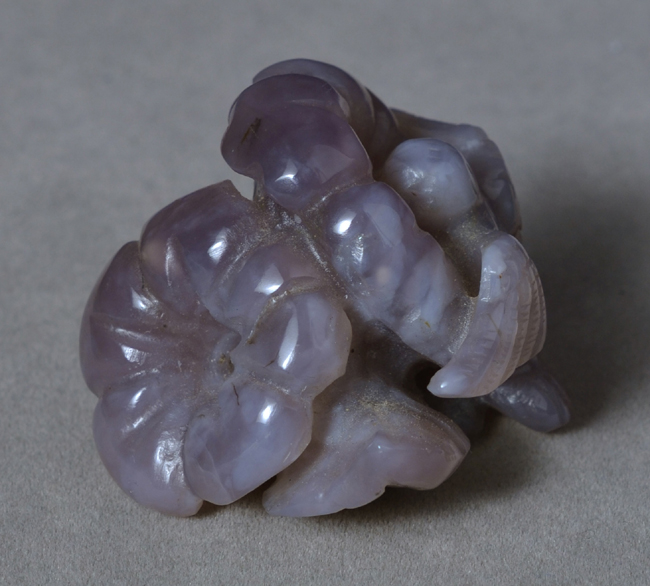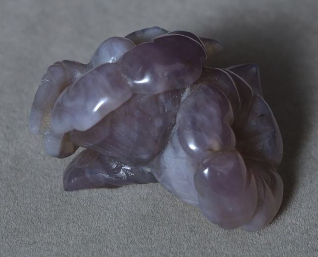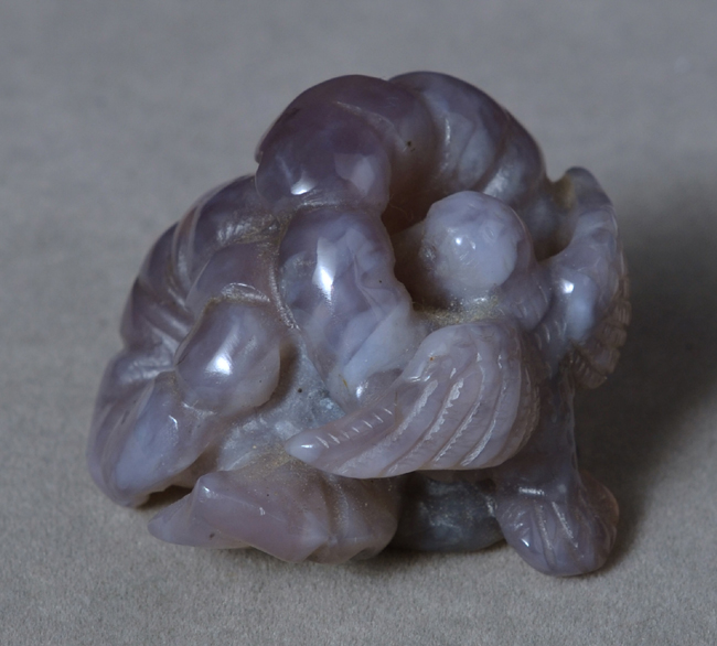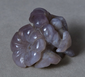 | Interesting purple chalcedony carving of a hummingbird feeding in flowers. | |