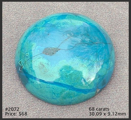 Chrysocolla has lines which are exagerated in some of the photos and are a natural part of the stone. All these stones have a high polish and have good face up eye appeal. These pages may not view well on some older computers because of the large file size. If you are having difficulty you can view this same chrysocolla in a different format. Pass mouse over image for enlargement and information on stone. No need to click on image. | ||
