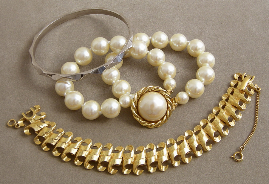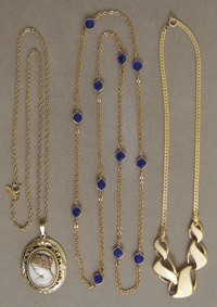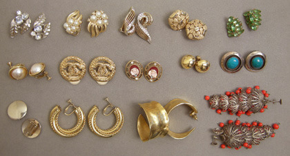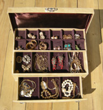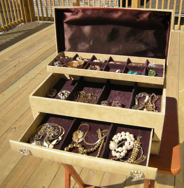 This is our long promised collection of estate jewelry to replace the estate jewelry that sold some while ago. Click on images for enlargements of the earrings, bracelets, brooches, pins and necklaces. The Lady Buxton box is included with this estate jewelry and is sturdy and in good condition. The top of the box has several small nicks. Price: $130 Please tell us if you want the box and how you wish to pay. We can bill you by email through PayPal, or you can send us payment by check or money order.