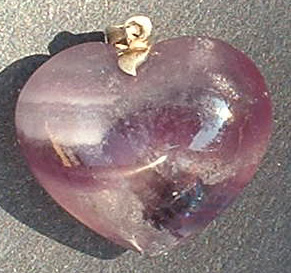 | Purple banded fluorite heart shaped pendant is 60ct with a sterling silver bale. Dimensions are 14mm by 27mm by 27mm. |