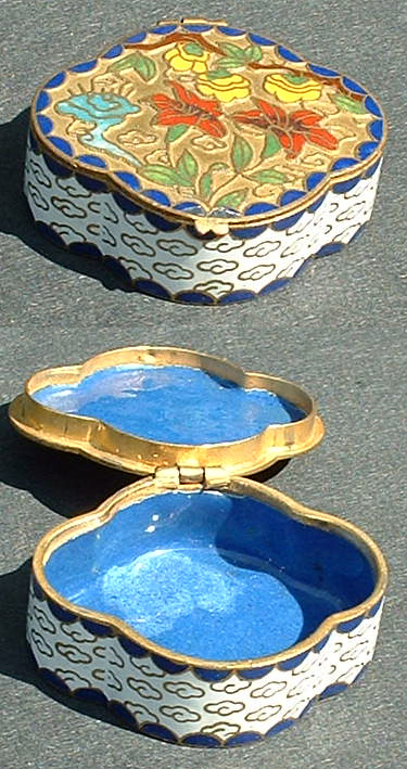Cloisonne' trinket box. 17mm by 43mm by 50mm.