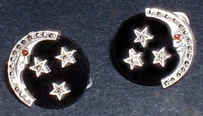 | Sterling silver moons and stars studded with marcacite stones on black onyx. The eyes are small rubies. These are clip earrings and the black onyx measures 21mm in diameter. |