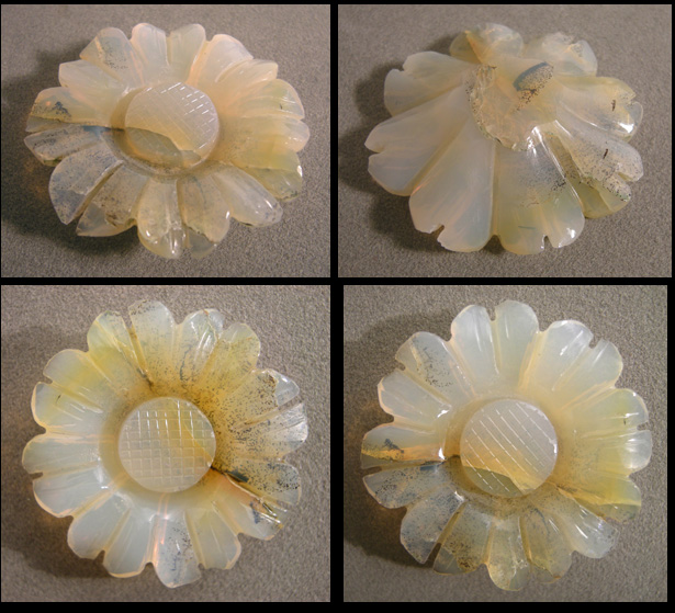 | Carving of flower from Australian crystal opal. The darker area is colored by small green inclusions. A slight crack separating the dark from light areas is not as obvious as in the top photo and does not detract from the face up appeal. |