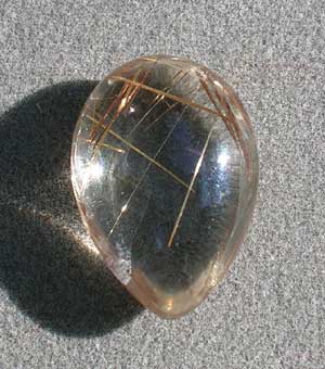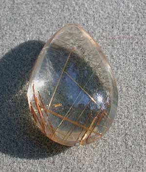 | Clear quartz crystal with golden rutile needles. Drop shaped cabochon rounded front and back. | |