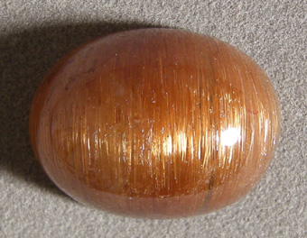 | Honey eye rutilated quartz cabochon with parallel golden rutiles that give cat's eye chatoyance. | |