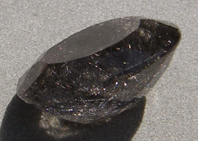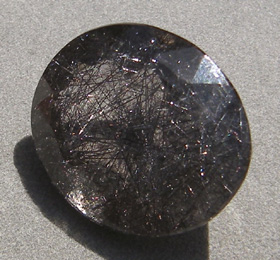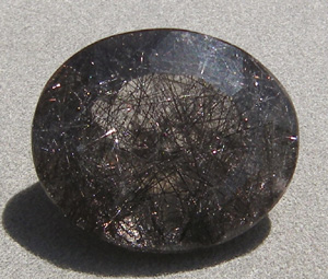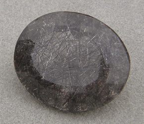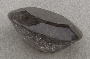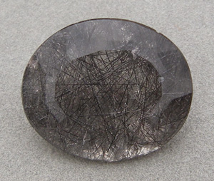 This rutilated smoky quartz faceted oval has dark tourmaline rutiles.