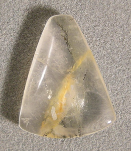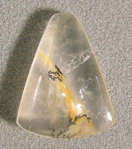 | This freeform cab has yellow and black dendrites and is a rounded triangle with rounded front and back. | |