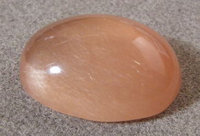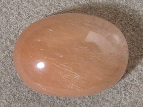 Red rutiles in this rutilated quartz qive the cabochon a pink hue.