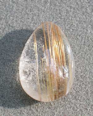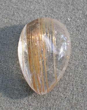 | Quartz cabochon with parallel golden rutiles and other smaller inclusion. Drop shaped, rounded front and back. | |