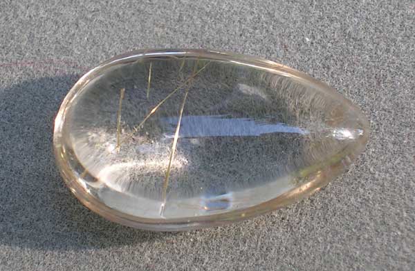 | Very clear quartz crystal with beautiful golden rutiles. Drop shaped cabochon is symmetrically rounded. Other small inclusions on tip. |