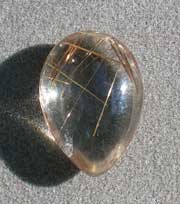 ![]() Clear quartz crystal cabochon with golden rutiles. |