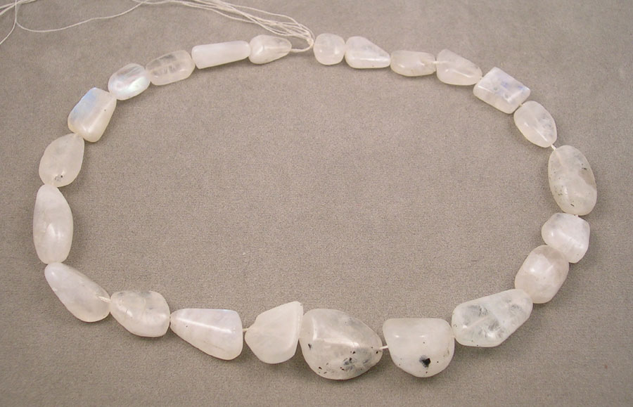 | Strand of moonstone beads--nuggets. Beads show more schiller (blue from inside) than you can see here. |