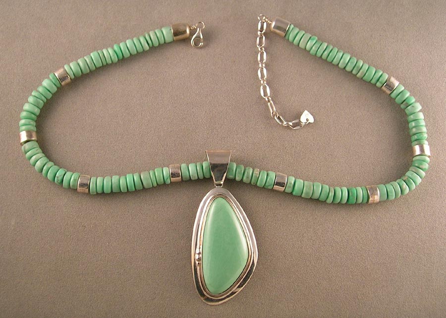 | Hand carved varcacite beads and pendant set in sterling silver. 120 carat pendant and 280 carats of rondelles. 16 inches of rondelle beads plus 3 inch extender. |