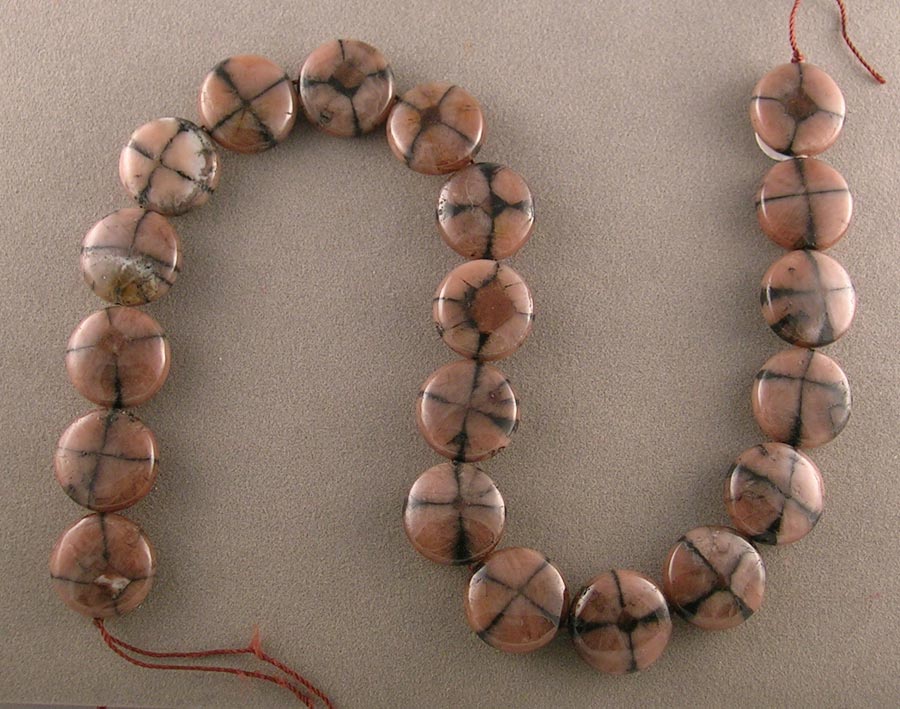 | These beads are a variety of andalusite called chiastolite. The X's are from brown clay inclusion. |