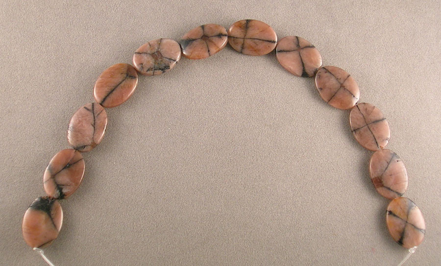 | Strand of large chiastalite flat oval beads. Chiastalite is a variety of andlucite. |