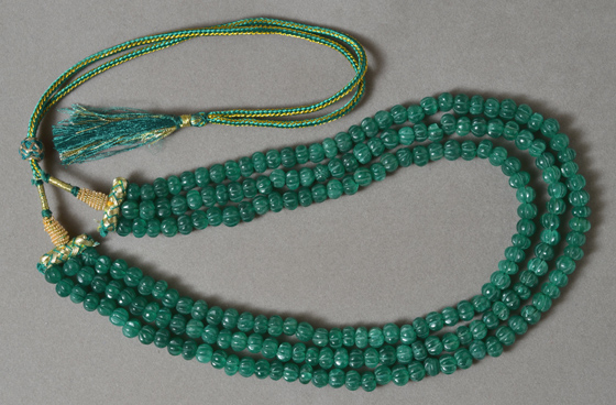 | Three strands of carved emerald rondelle beads on a braided necklace. This necklace is ornate and pretty but would not be very durable-- the thread the beads are strung on is thin. Could be worn but we recommend restringing. These translucient beads are from India. They are rubbed with dyed olive oil to enhance color. |