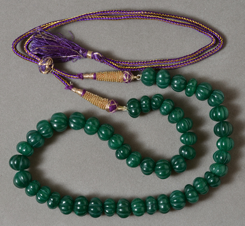| Hand carved rondelle beads from translucent green Indian Emerald. These beads are on thin thread so we recommend restringing. The beads are rubbed with dyed olive oil to enhance color. |
