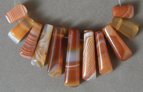 | Set of 11 graduated trapezoidal freeform beads from carnelian agate forming a fan shape on strand. |