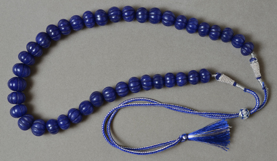 | Larger carved sapphire rondelle bead strand. This is opaque Indian sapphire of bead quality meaning it is mixed with other minerals. The ornate cord they are strung on is weak and we recommend restringing for wear. The beads are rubbed with dyed olive oil to enhance color. |