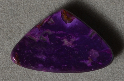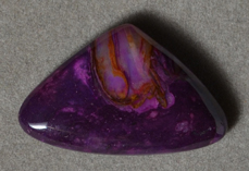 | Triangle shaped sugilite cab with curved sides. Purple shades with some brown bustamite. | |