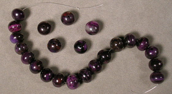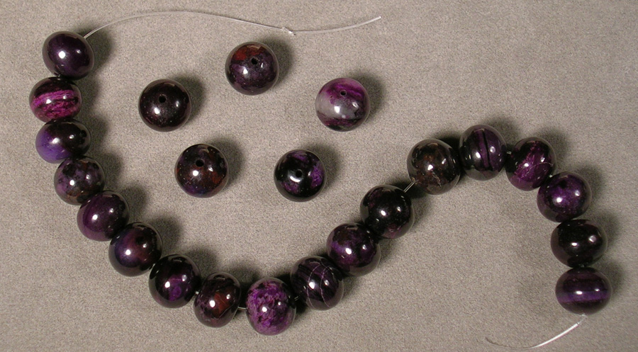 | Dark colored sugilite round beads. High manganese content produces dark colored sugilite. |