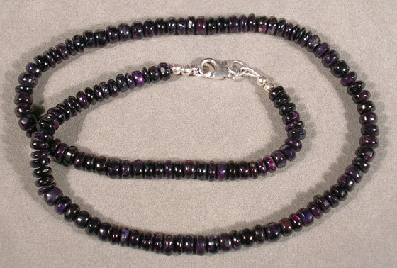 | Sugilite rondelle bead strand. Dark colored--high manganese content. These beads really sparkle in most types of light. |