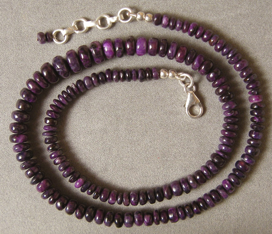 | This necklace/strand has purple sugilite with some grey from the manganese present with the sugilite. The necklace is 18.5 inches with silver clasps and 16 inches of beads. |