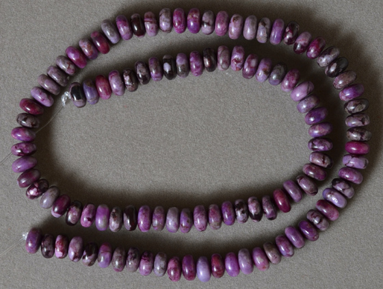 | This strand of sugilite beads is almost identical to the previous strand with a mix of medium to dark rondelles. |